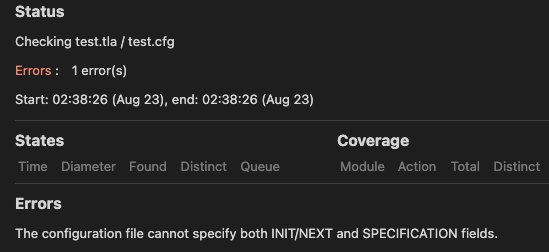 When I run the checker with this configuration file, I am greeted with another error: “The configuration file cannot specify both INIT/NEXT and SPECIFICATION fields”.