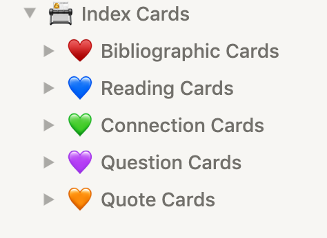 Readings Index Card collection is made in the same vein as the Bibliographic Index Card Collection. Here is what mine looks like: